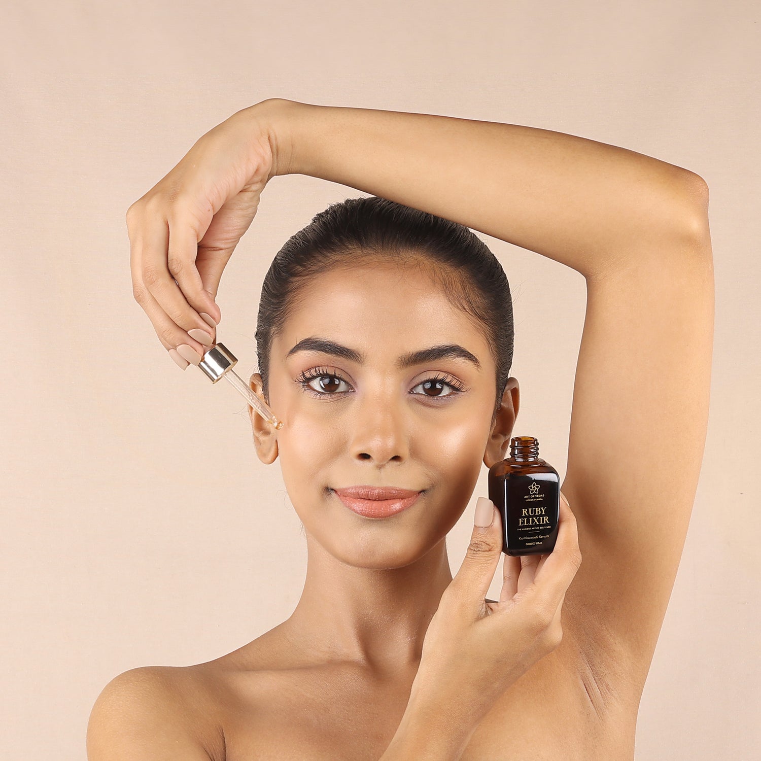1. Serum Ruby Elixir Kumkumadi (30ml): Luksusowa mieszanka szafranu i ziół ajurwedyjskich, która zwiększa blask, poprawia strukturę skóry i wyrównuje koloryt.