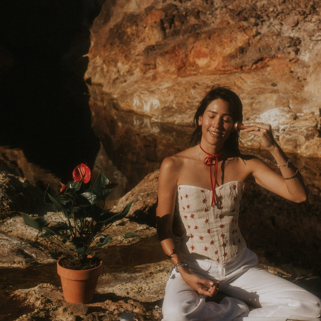 Rozpocznij swój codzienny lub cotygodniowy rytuał pielęgnacyjny, delikatnie nakładając serum Kumkumadi na twarz i szyję. Używając Kansa Wand, wykonuj rytmiczne, okrężne ruchy na punktach marma na twarzy. Ta tradycyjna technika nie tylko głęboko odżywia skórę, ale także harmonizuje dosze i sprzyja relaksowi.